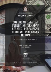 Magister Akuntansi kembali mengadakan Kuliah Umum dengan tema Dukungan Data dan Penelitian terhadap Strategi Perpajakan di Bidang Penegakan Hukum. Mengingat Perpajakan dan Hukum sangat erat