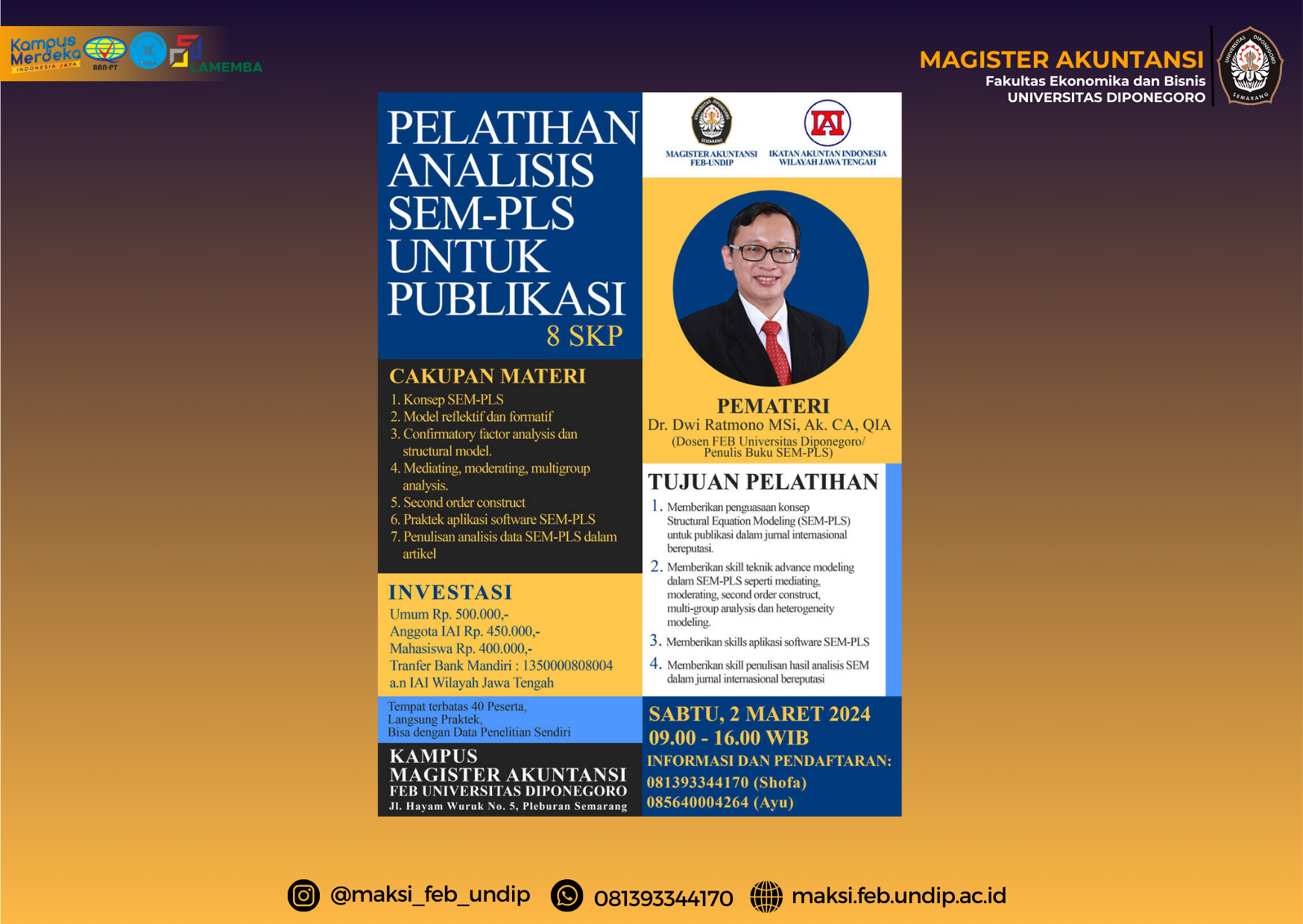 Magister Akuntansi bekerja sama dengan Ikatan Akuntan Indonesia Wilayah Jawa Tengah mengadakan Pelatihan Analisis SEM-PLS Untuk Publikasi pada Sabtu, 2 Maret 2024 di Kampus Magister Akuntansi FEB Undip,